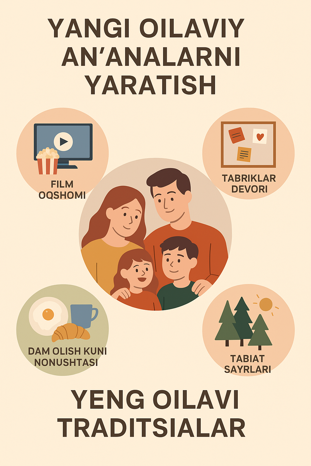 Yangi oilaviy traditsiyalar bu – sizning oilangizga xos iliq, mehrli va unutilmas lahzalarni yaratish vositasi. Ular bolalarda mustahkam xotiralar, ota-onalarda esa yaqinlik hissini uyg‘otadi. Har bir kichik an’ana katta qiymatga ega bo‘lishi mumkin.